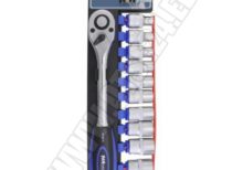 ”Komplektis 1/2´´” padrunid 8,9,10,11,12,13,14,15,16,17,18,19,20,21,22,23,24,27,30,32mm, narre, pikendused 2tk, T-adapter, kardaan, tugevas plastkohvris.” |